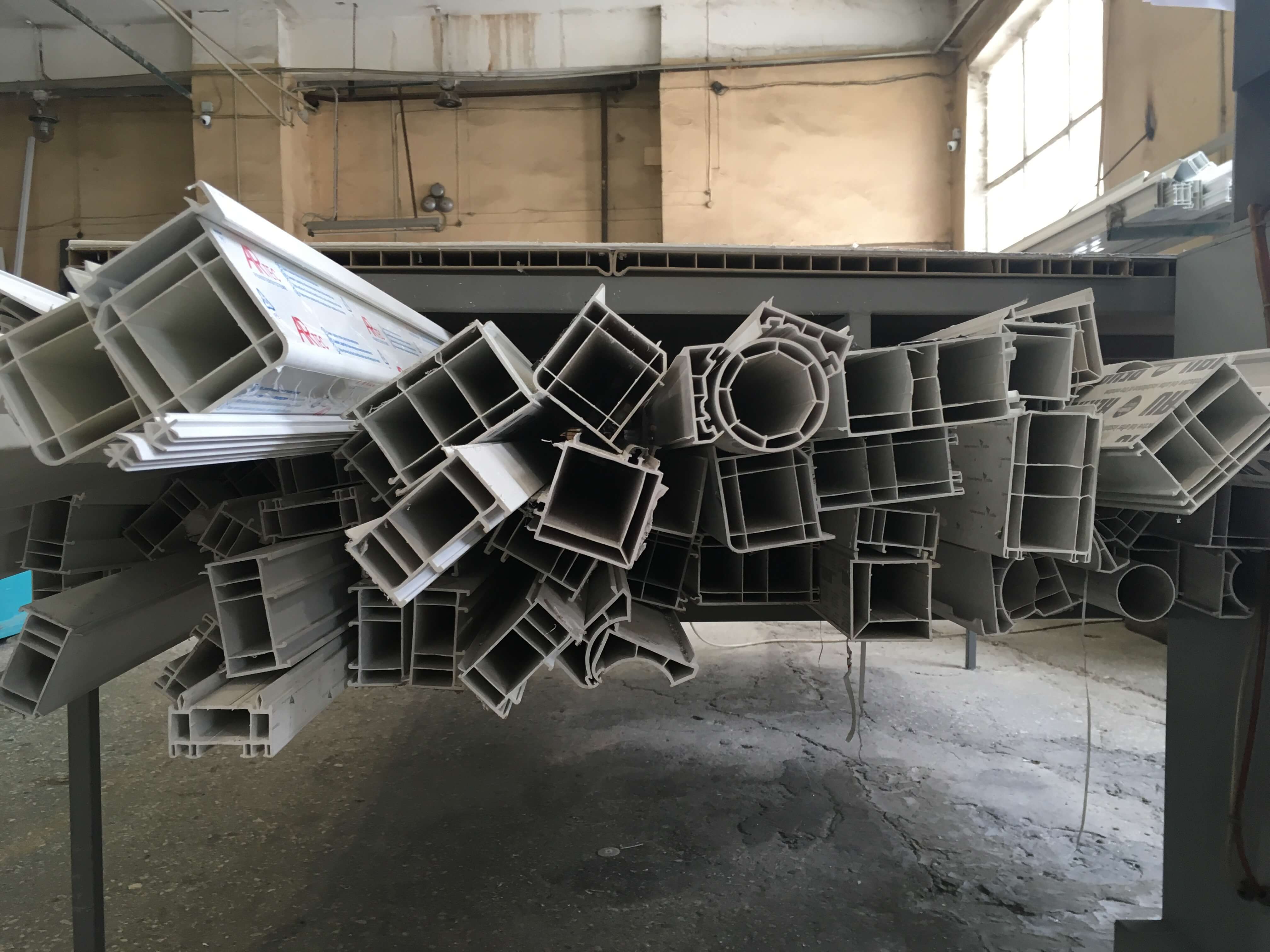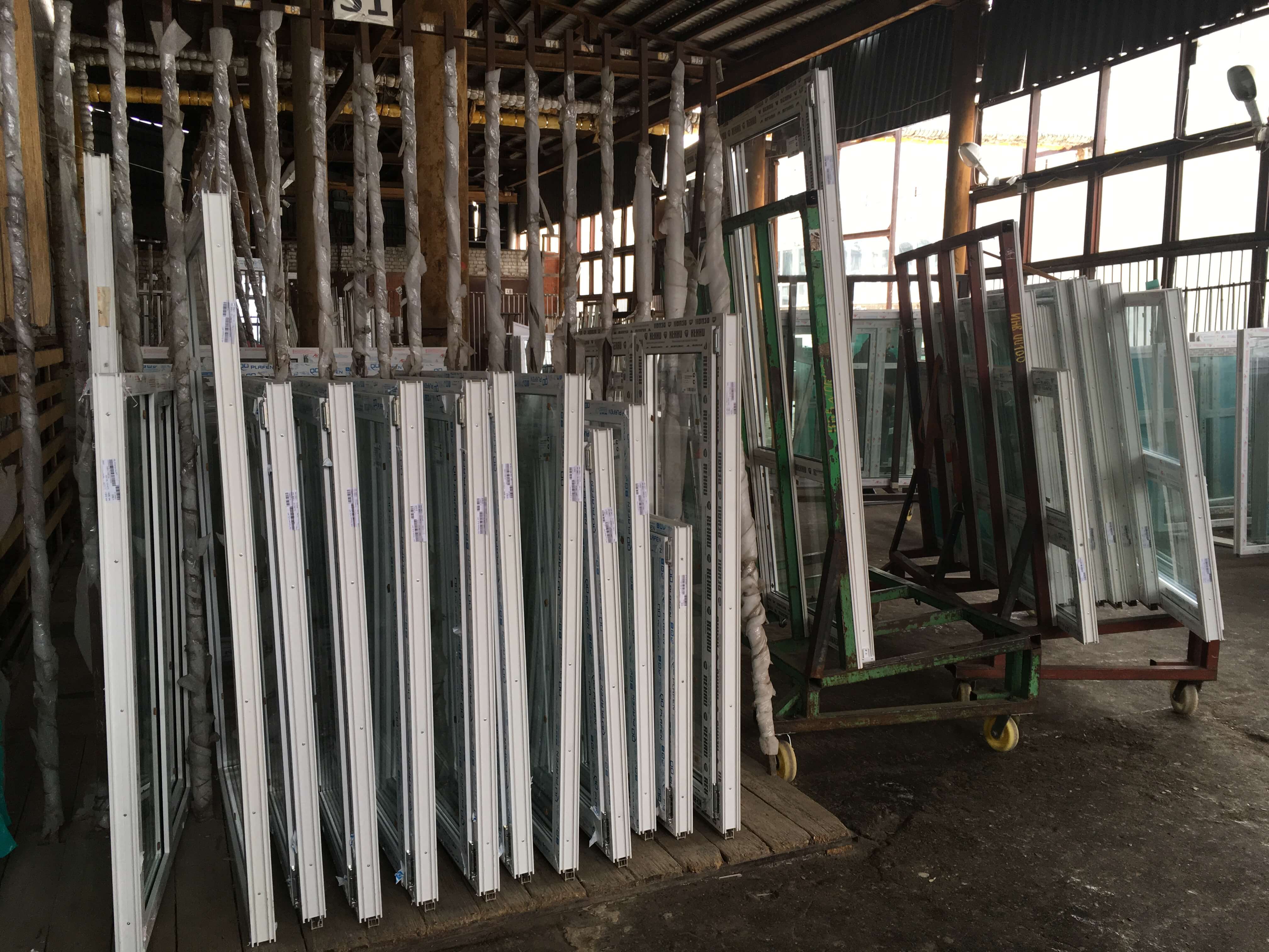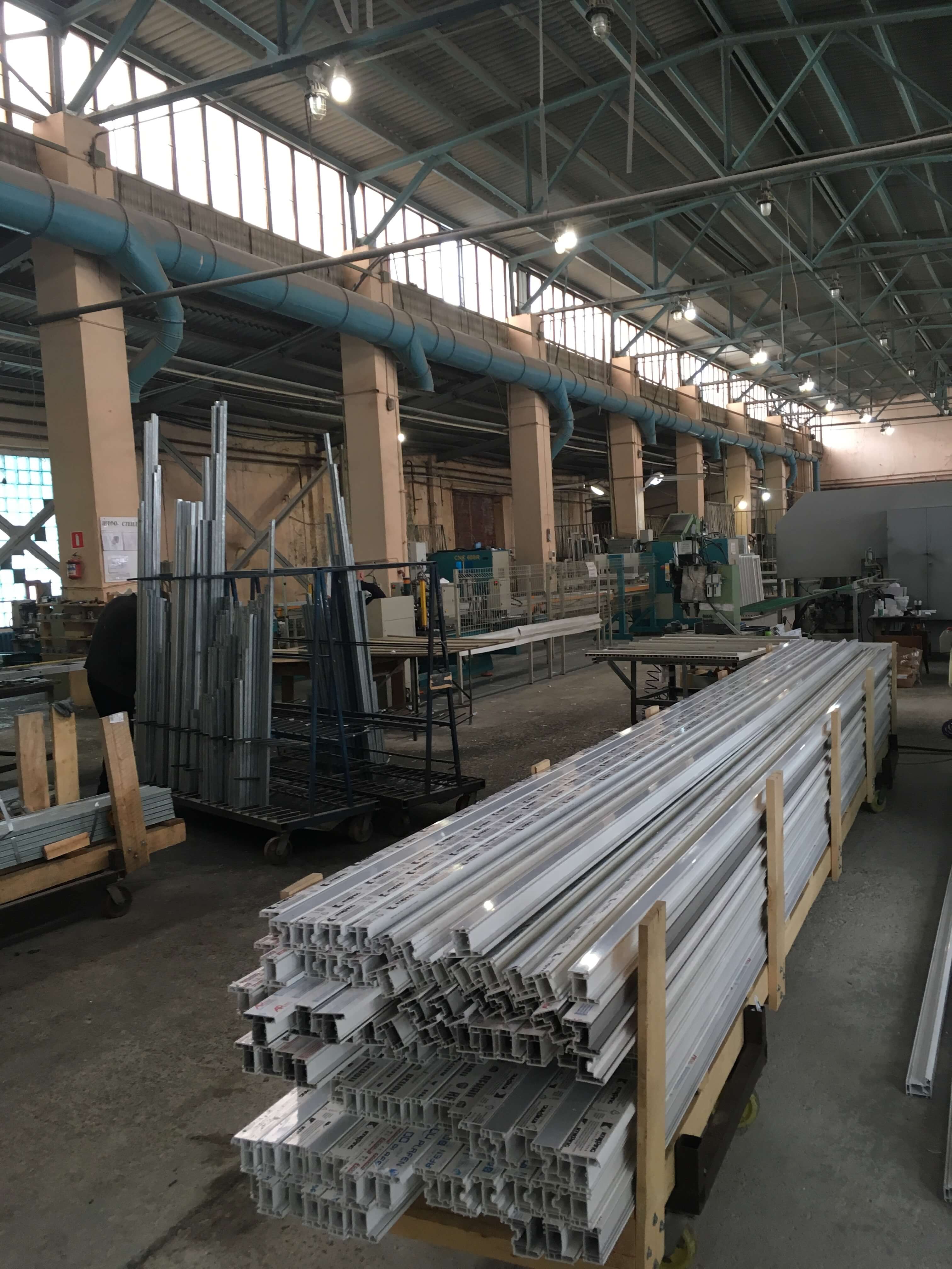 В специальных стойках ожидают отправку готовые изделия из поливинилхлорида